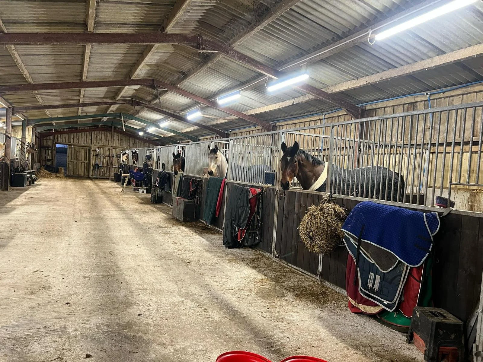 Our secure facilities include comfortable stables in an open and airy barn, a dedicated indoor wash-bay, a spacious tack room and fully equipped kitchen, a large outdoor school with a variety of fences, an outdoor lunging ring and local hacking on quiet country lanes.